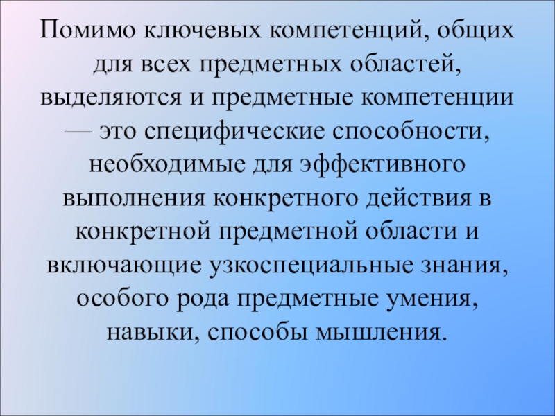 Слайд 15Помимо ключевых компетенций, общих для всех предметных областей, выделяются и предметные