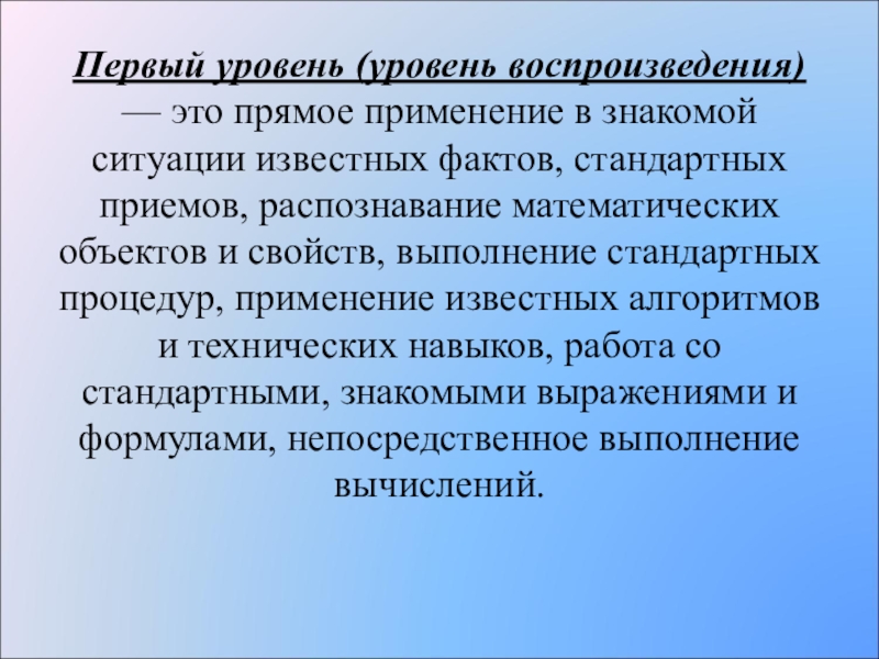 Слайд 22Первый уровень (уровень воспроизведения) — это прямое применение в знакомой ситуации