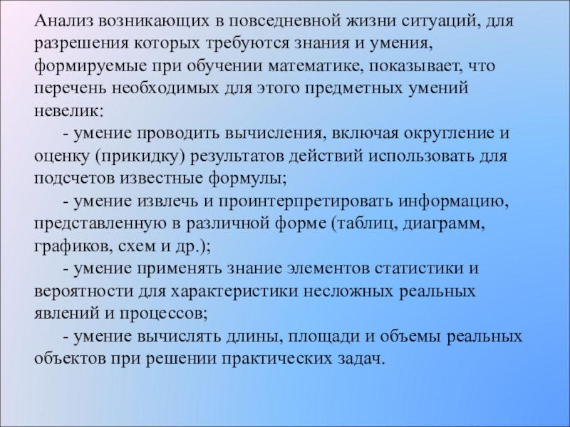 и умения, формируемые при обучении математике, показывает, что перечень необходимых для этого предметных умений невелик: