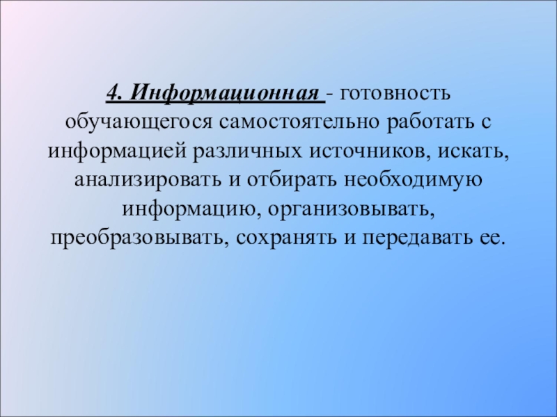 Слайд 94. Информационная - готовность обучающегося самостоятельно работать с информацией различных источников,