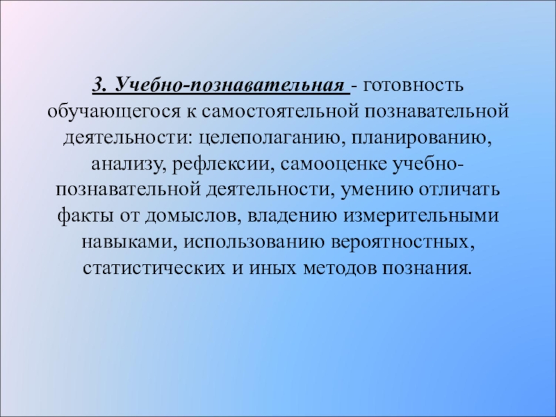 Слайд 83. Учебно-познавательная - готовность обучающегося к самостоятельной познавательной деятельности: целеполаганию, планированию,