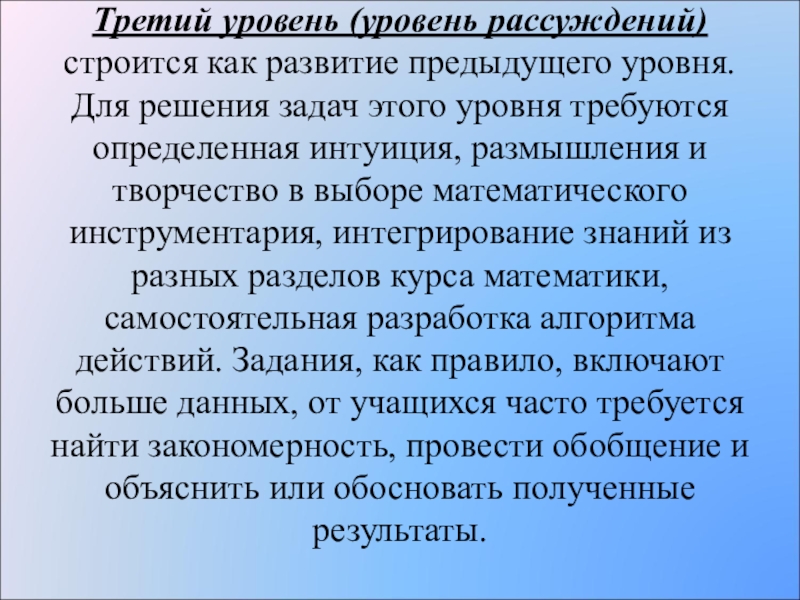 Слайд 24Третий уровень (уровень рассуждений) строится как развитие предыдущего уровня. Для решения