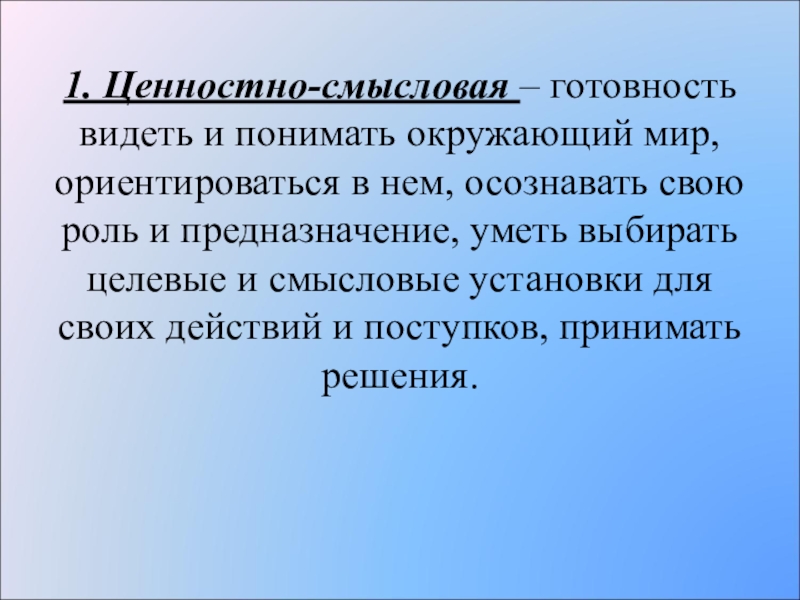 Слайд 61. Ценностно-смысловая – готовность видеть и понимать окружающий мир, ориентироваться в