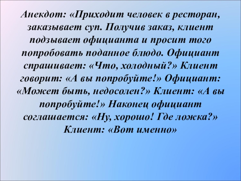 Слайд 13Анекдот: «Приходит человек в ресторан, заказывает суп. Получив заказ, клиент подзывает
