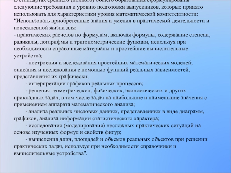 подготовки выпускников, которые принято использовать для характеристики уровня математической компетентности: “Использовать приобретенные знания и умения в практической деятельности и повседневной жизни для: