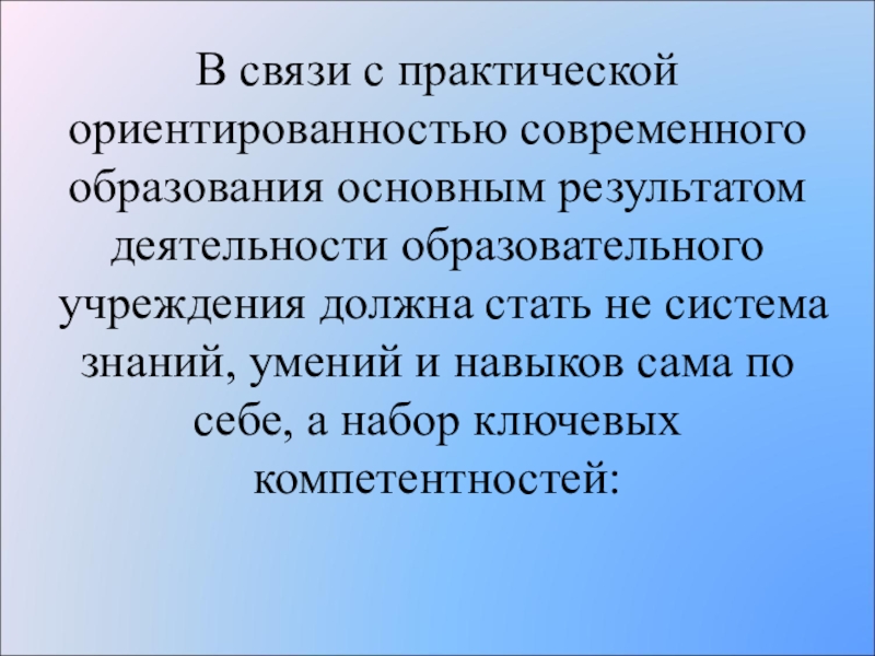 учреждения должна стать не система знаний, умений и навыков сама по себе, а набор ключевых компетентностей: