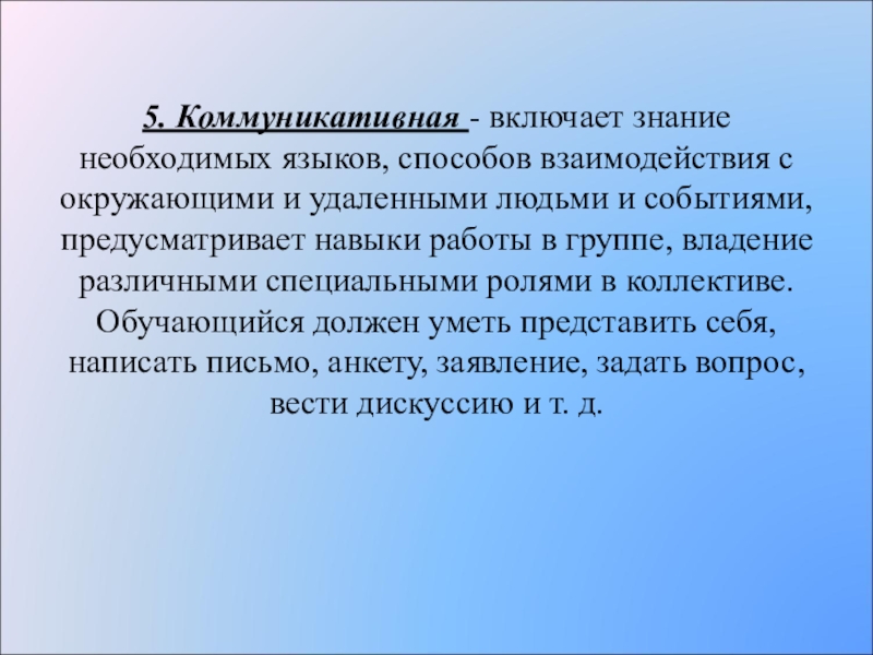 Слайд 105. Коммуникативная - включает знание необходимых языков, способов взаимодействия с окружающими