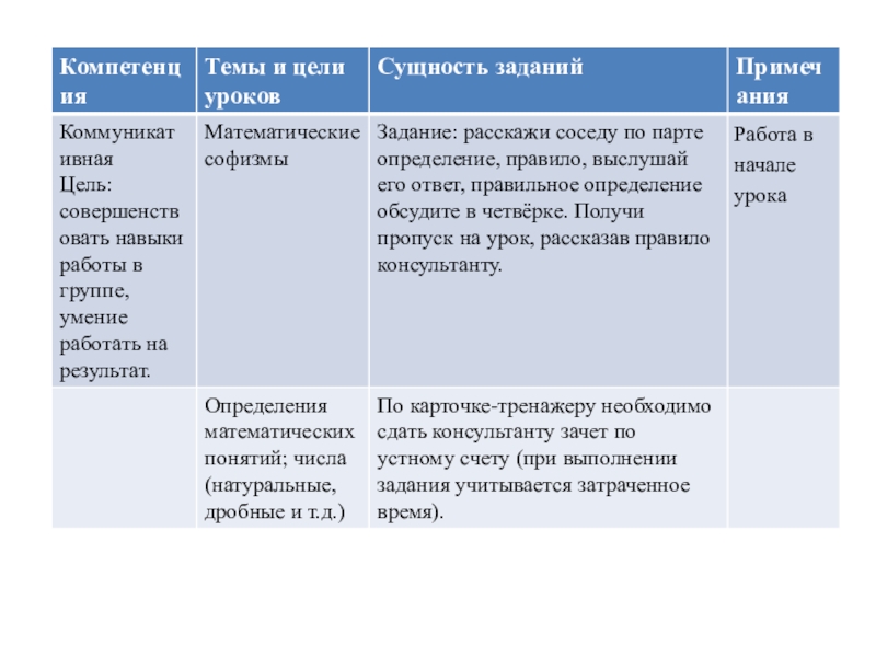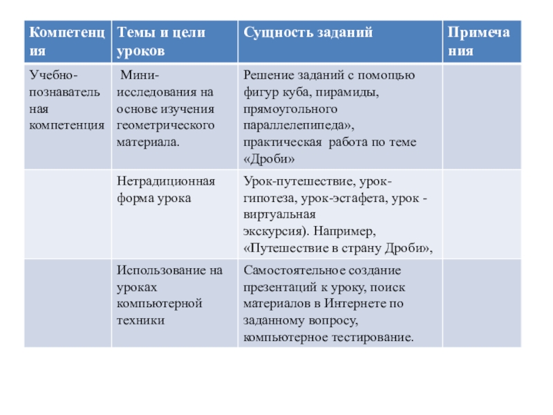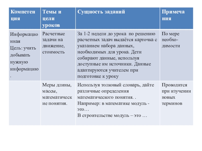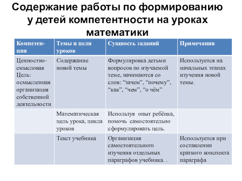 Слайд 7Содержание работы по формированию у детей компетентности на уроках математики