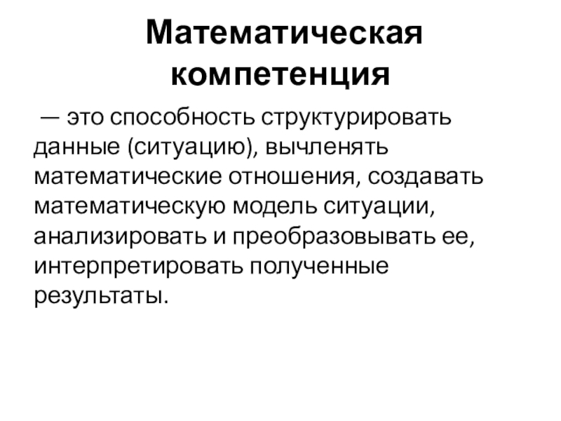Математическая компетенция — это способность структурировать данные (ситуацию), вычленять математические отношения, создавать математическую модель ситуации, анализировать и преобразовывать