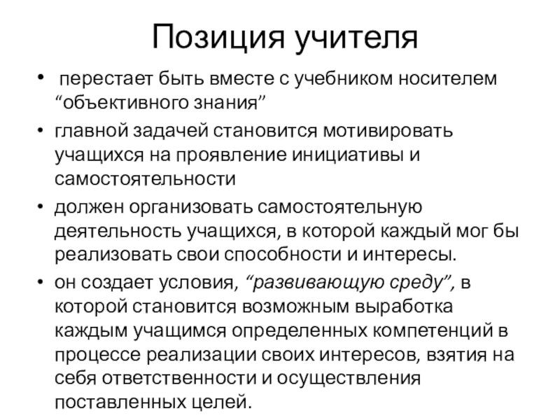 Позиция учителя перестает быть вместе с учебником носителем “объективного знания”главной задачей становится мотивировать учащихся на проявление инициативы
