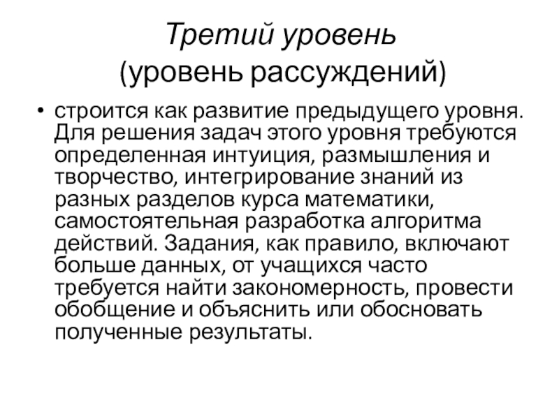 Третий уровень  (уровень рассуждений)строится как развитие предыдущего уровня. Для решения задач этого уровня требуются определенная интуиция, размышления