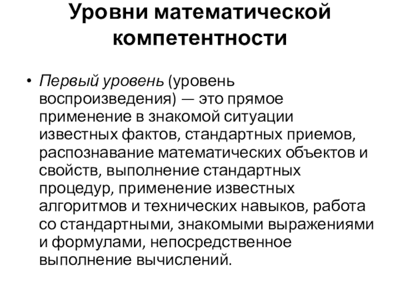 Уровни математической компетентности Первый уровень (уровень воспроизведения) — это прямое применение в знакомой ситуации известных фактов, стандартных приемов,