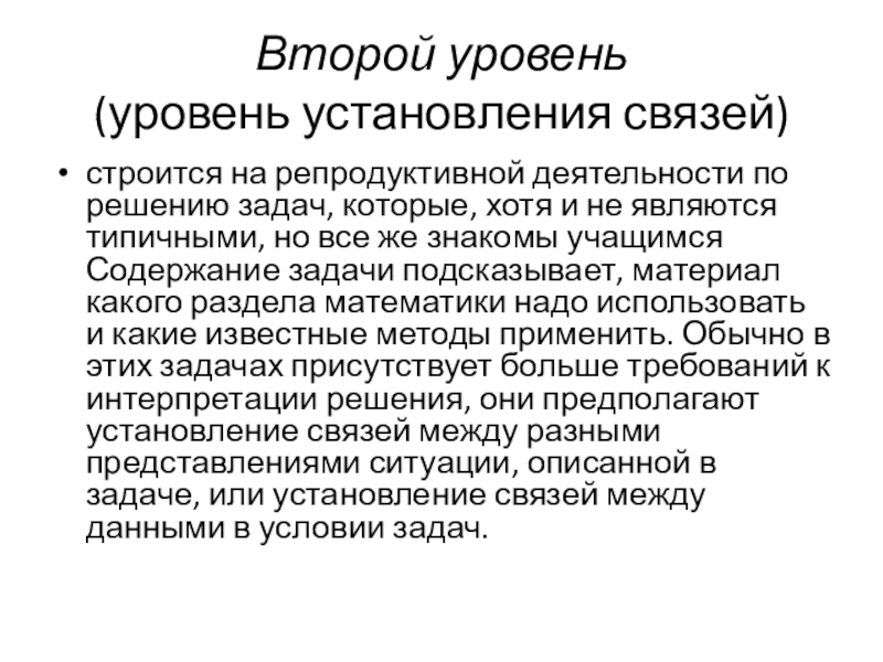Второй уровень  (уровень установления связей) строится на репродуктивной деятельности по решению задач, которые, хотя и не являются