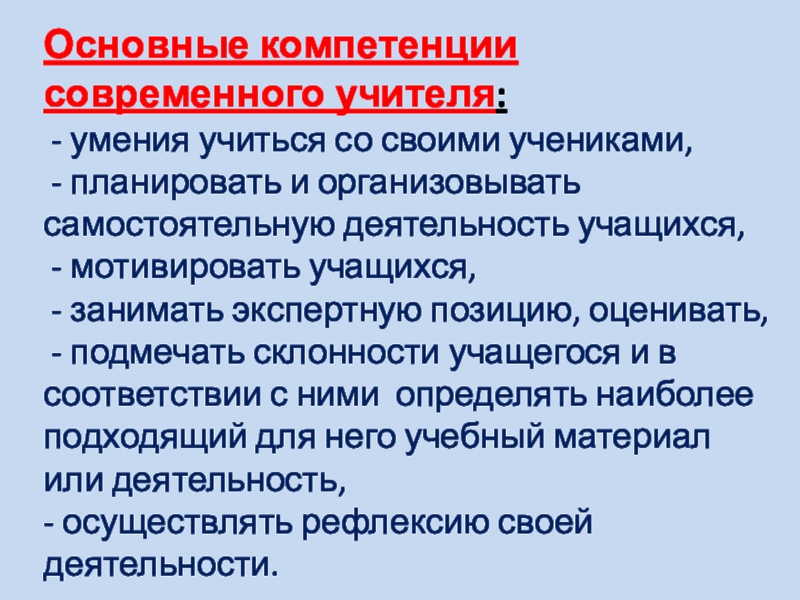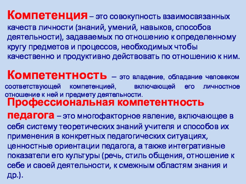 Профессиональная компетентность педагога – это многофакторное явление, включающее в себя систему теоретических знаний учителя и способов их применения в конкретных педагогических ситуациях, ценностные ориентации педагога, а также интегративные показатели его культуры (речь, стиль общения, отношение к себе и своей деятельности, к смежным областям знания и др.).