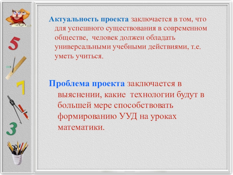 Проблема проекта заключается в выяснении, какие технологии будут в большей мере способствовать формированию УУД на уроках математики.
