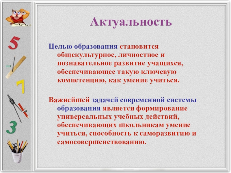 Важнейшей задачей современной системы образования является формирование универсальных учебных действий, обеспечивающих школьникам умение учиться, способность к саморазвитию и самосовершенствованию.