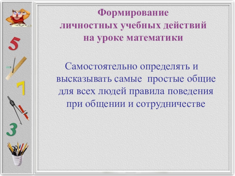 действия школьников будут тем эффективнее формироваться, чем чаще будут применяться на уроках математики технологии, ориентированные на формирование личностных, социальных, познавательных и коммуникативных способностей учащихся.