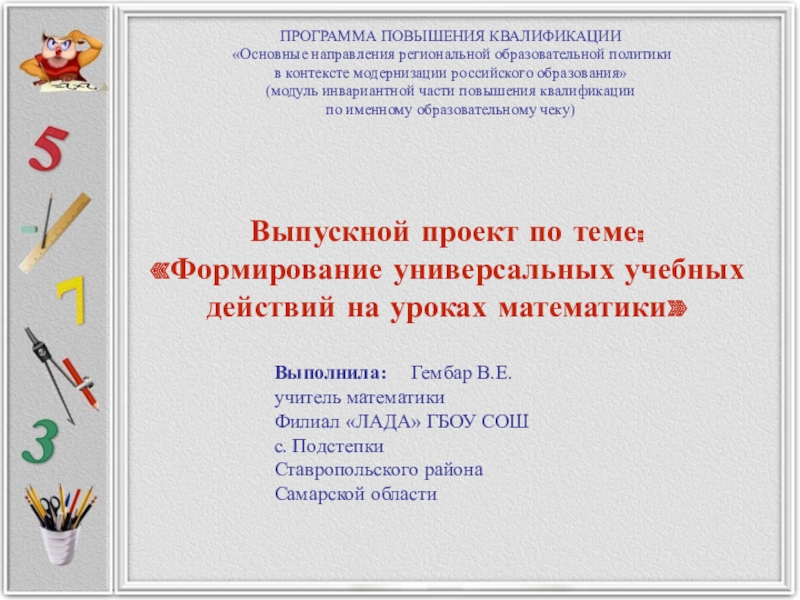 Слайд 1Выпускной проект по теме: «Формирование универсальных учебных действий на уроках математики»
