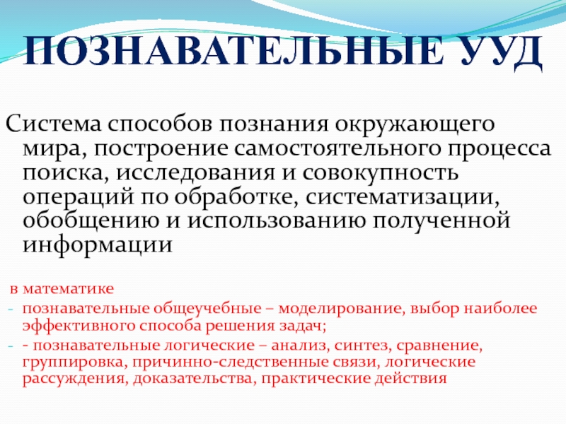 ПОЗНАВАТЕЛЬНЫЕ УУДСистема способов познания окружающего мира, построение самостоятельного процесса поиска, исследования и совокупность операций по обработке, систематизации,