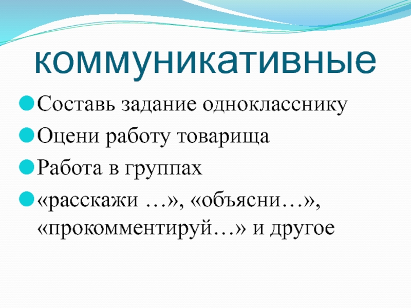 коммуникативныеСоставь задание одноклассникуОцени работу товарищаРабота в группах«расскажи …», «объясни…», «прокомментируй…» и другое