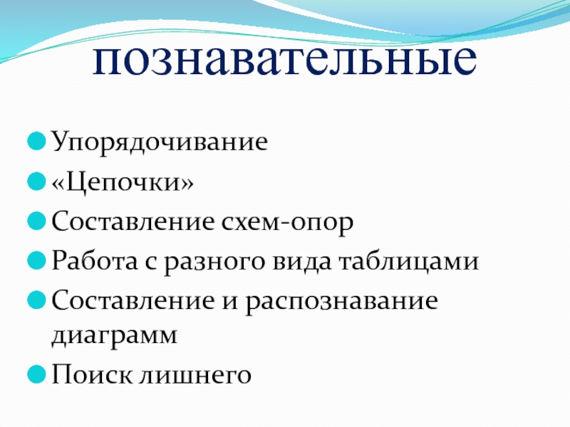 познавательныеУпорядочивание«Цепочки»Составление схем-опорРабота с разного вида таблицамиСоставление и распознавание диаграммПоиск лишнего