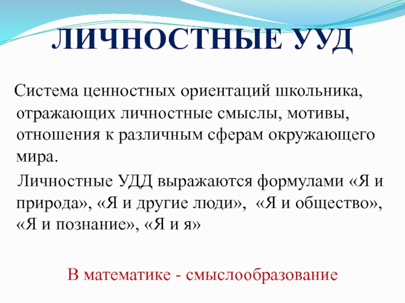 Личностные УДД выражаются формулами «Я и природа», «Я и другие люди», «Я и общество», «Я и познание», «Я и я»