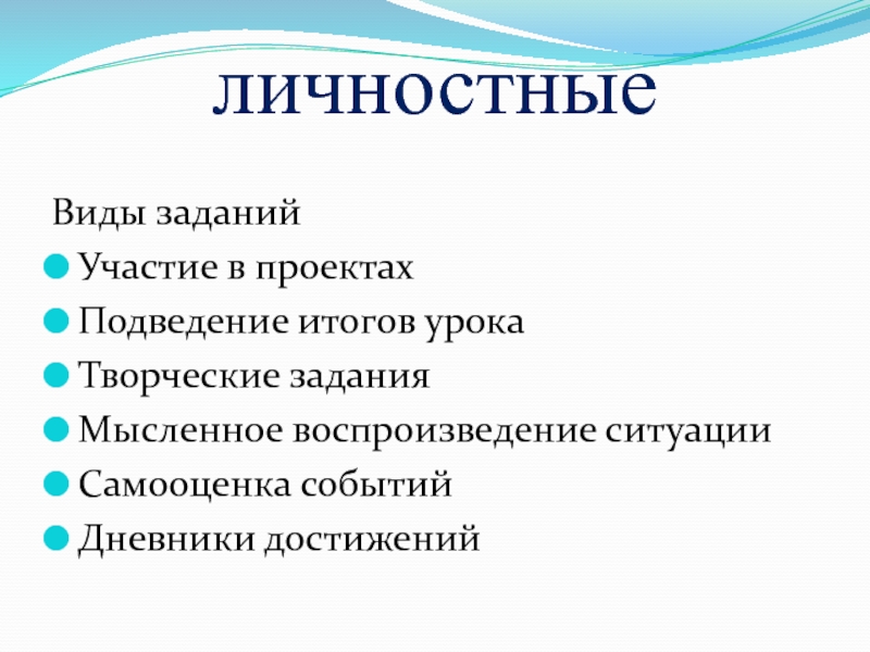 личностныеВиды заданийУчастие в проектахПодведение итогов урокаТворческие заданияМысленное воспроизведение ситуацииСамооценка событийДневники достижений