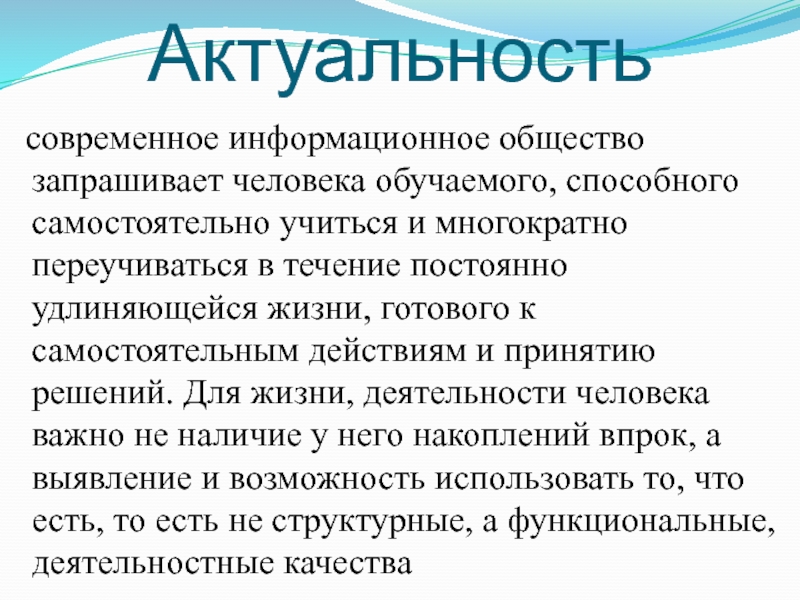 Актуальность  современное информационное общество запрашивает человека обучаемого, способного самостоятельно учиться и многократно переучиваться в течение постоянно