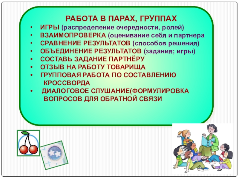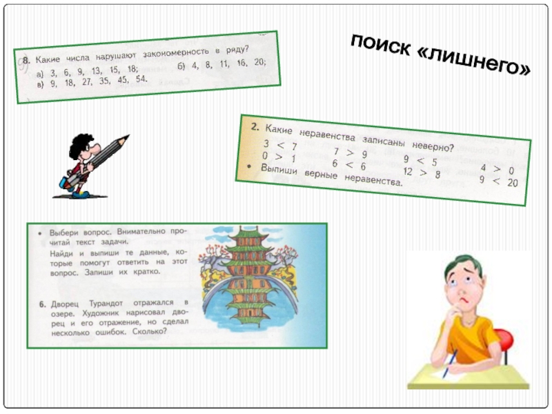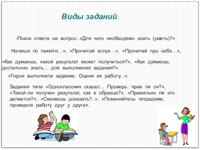 Задания типа «Одноклассник сказал… Проверь: прав ли он?», «Такой ли получен результат, как в образце?», «Правильно ли это делается?»; «Сможешь доказать?..», «Поменяйтесь тетрадями, проверьте работу друг у друга»,