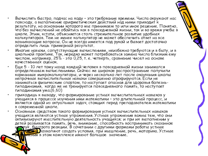 приходишь к выводу, что формирование устных вычислительных навыков у учащихся в процессе изучения ими математики – это длительный процесс, и является одной из актуальных задач, стоящих перед преподавателем математики в современной школе.