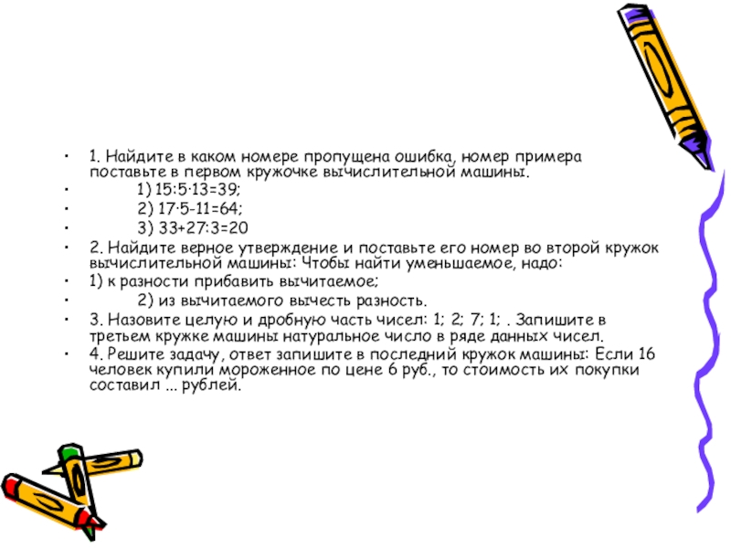 1. Найдите в каком номере пропущена ошибка, номер примера поставьте в