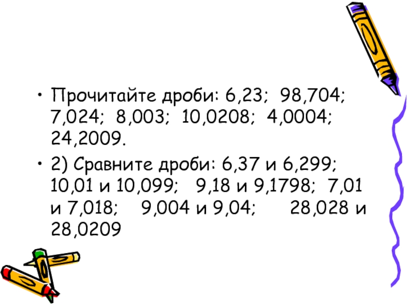 Слайд 11Прочитайте дроби: 6,23; 98,704; 7,024; 8,003; 10,0208; 4,0004; 24,2009.