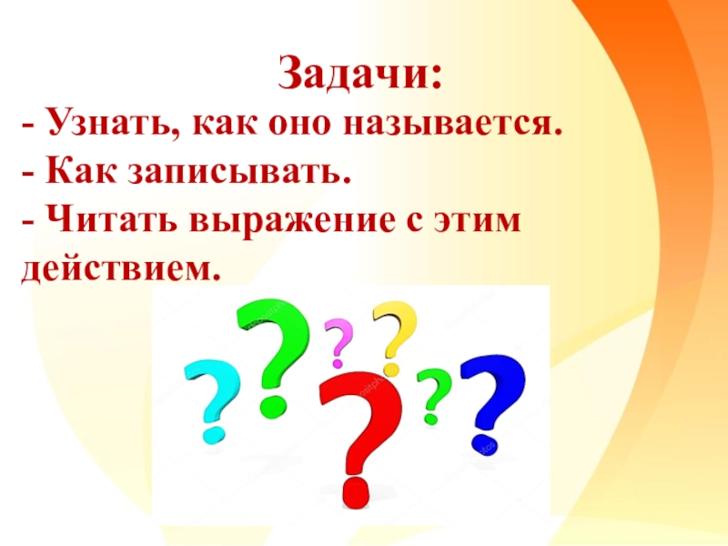 Задачи:- Узнать, как оно называется.- Как записывать.- Читать выражение с этим действием.