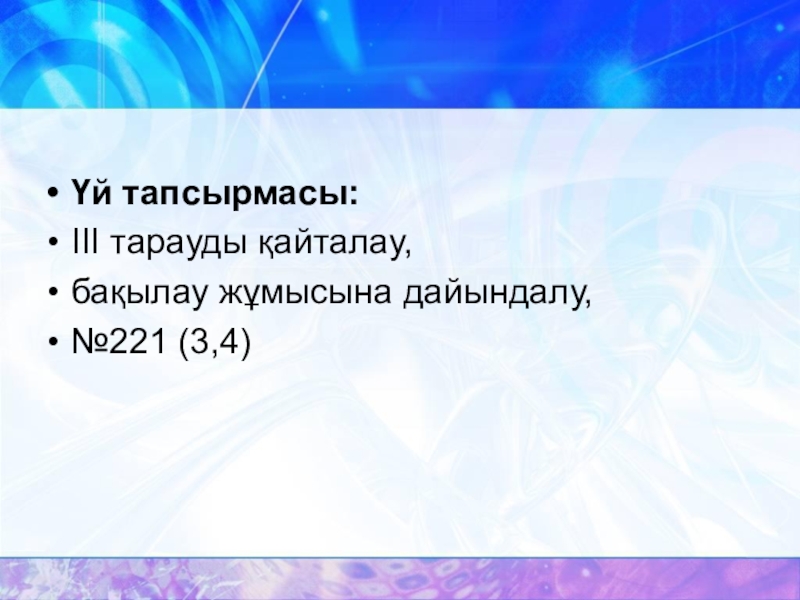 Үй тапсырмасы:ІІІ тарауды қайталау, бақылау жұмысына дайындалу,№221 (3,4)