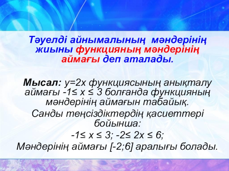 Слайд 12Тәуелді айнымалының мәндерінің жиыны функцияның мәндерінің аймағы деп аталады.