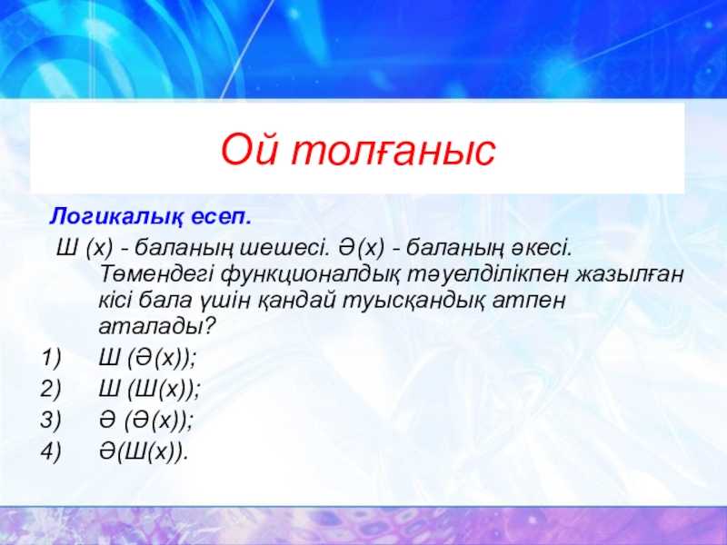 Ой толғанысЛогикалық есеп. Ш (х) - баланың шешесі. Ә(х) - баланың әкесі. Төмендегі функционалдық тәуелділікпен жазылған кісі