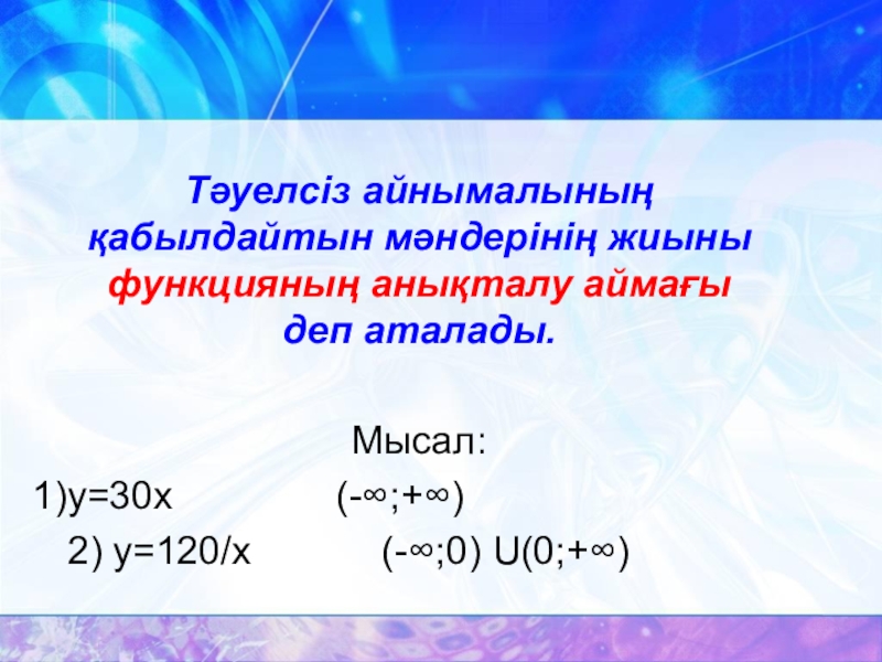 Слайд 11Тәуелсіз айнымалының қабылдайтын мәндерінің жиыны функцияның анықталу аймағы деп аталады.