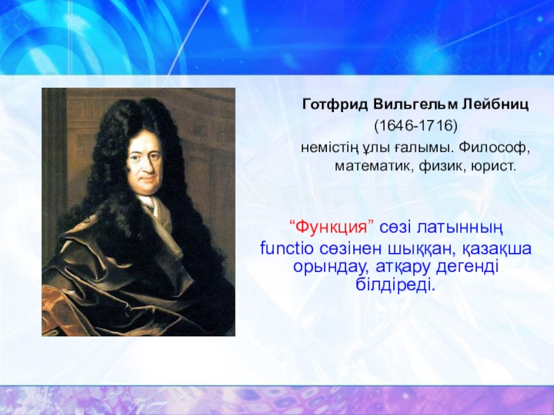 Готфрид Вильгельм Лейбниц(1646-1716)немістің ұлы ғалымы. Философ, математик, физик, юрист.“Функция” сөзі латынның functio сөзінен шыққан, қазақша орындау, атқару