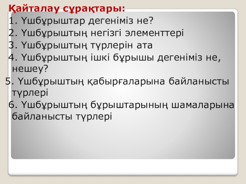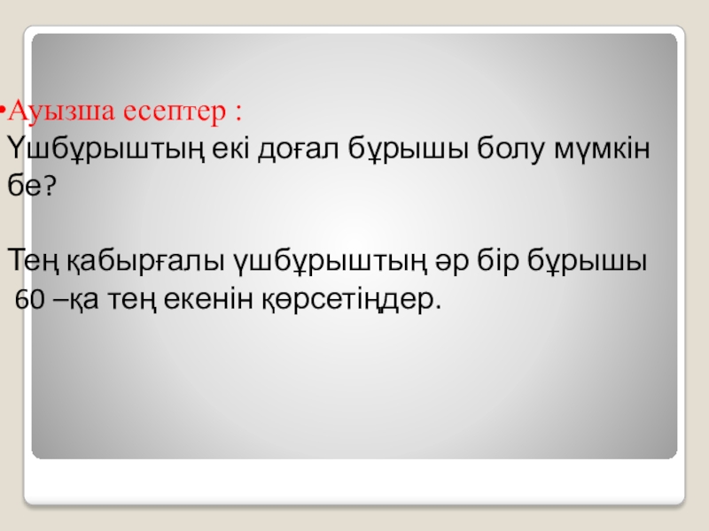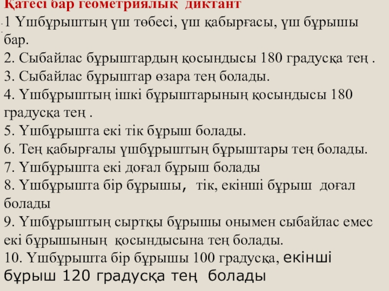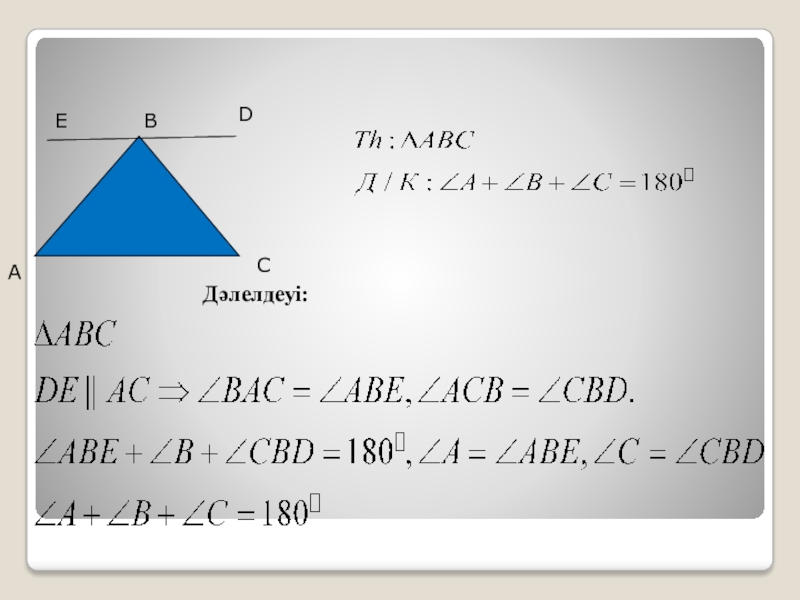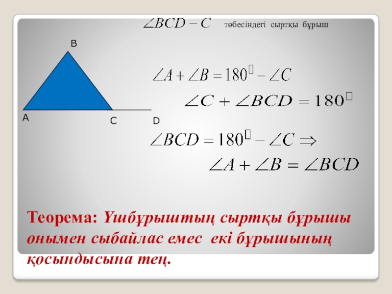 Теорема: Үшбұрыштың сыртқы бұрышы онымен сыбайлас емес екі бұрышының қосындысына тең.
