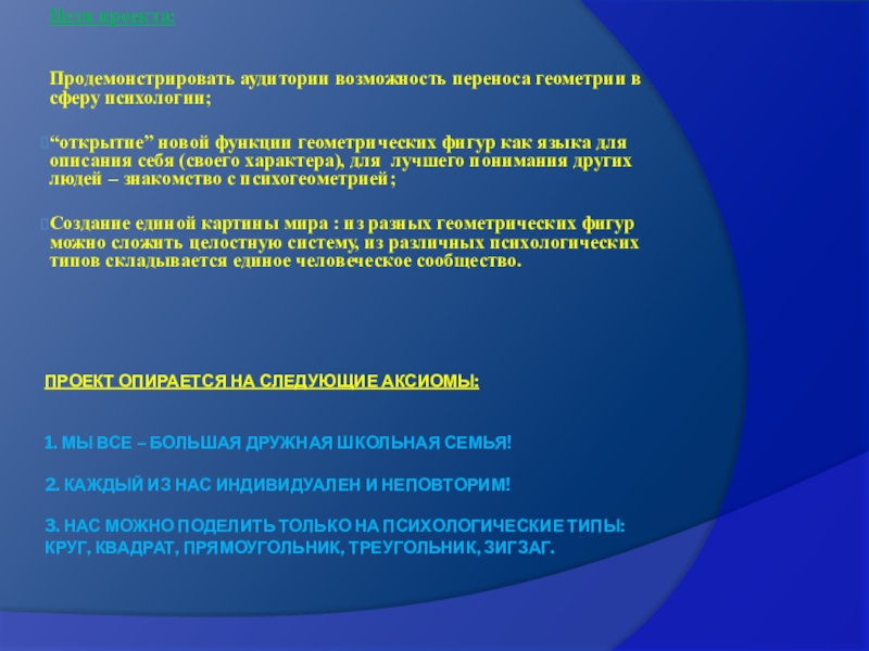 Продемонстрировать аудитории возможность переноса геометрии в сферу психологии;