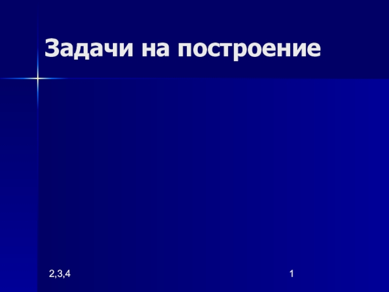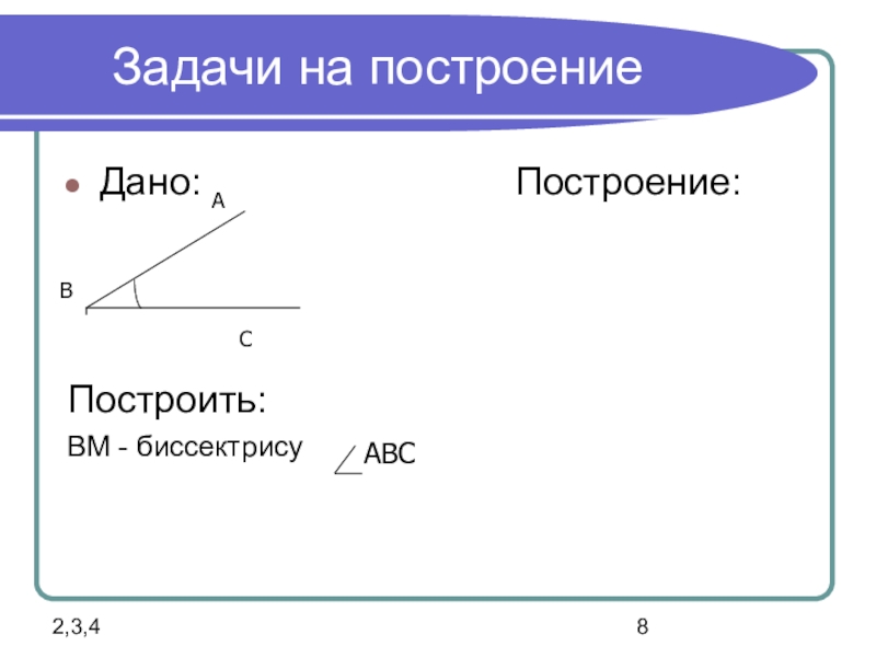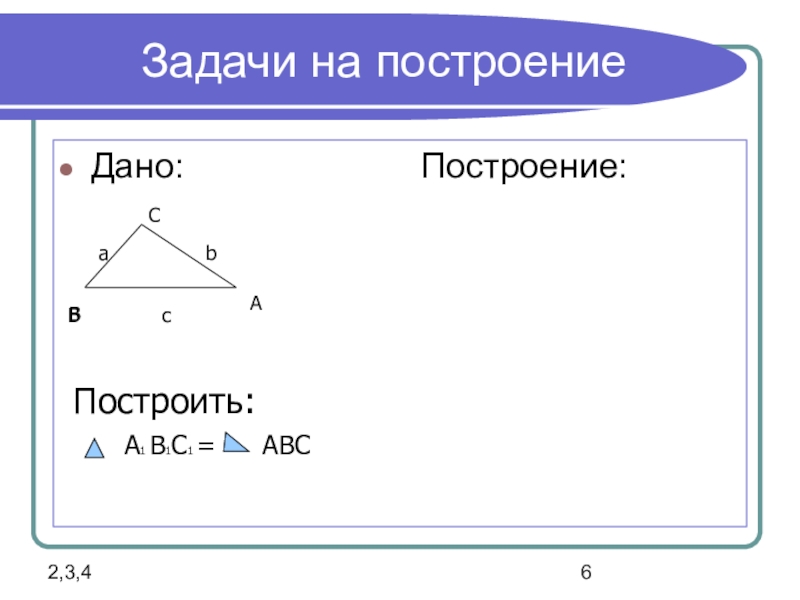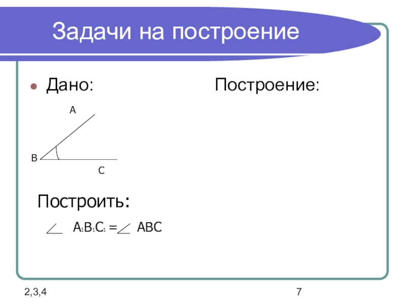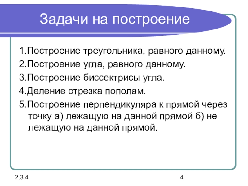 2,3,4    Задачи на построение1.Построение треугольника, равного данному.2.Построение угла, равного данному.3.Построение биссектрисы угла.4.Деление отрезка пополам.5.Построение