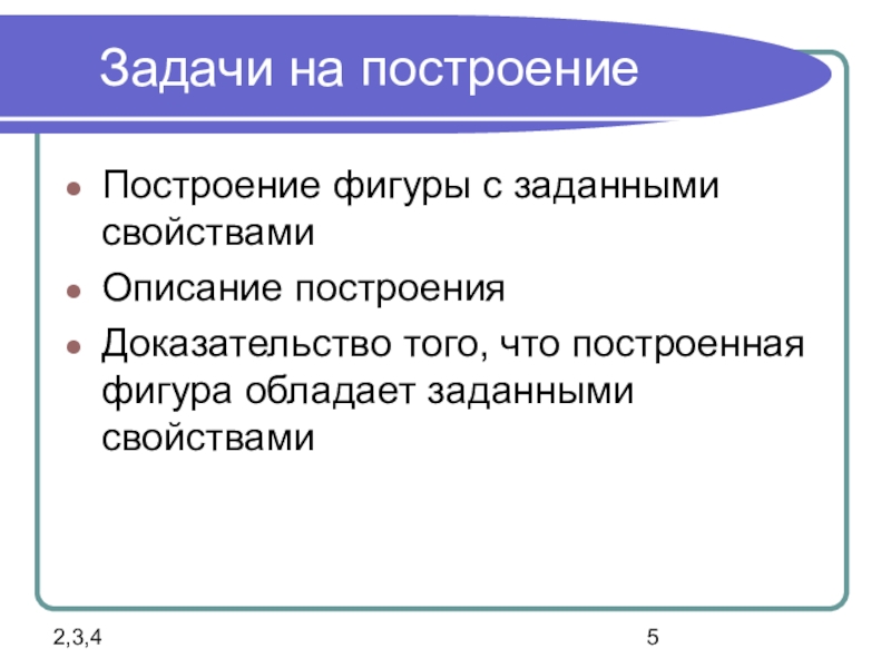 2,3,4   Задачи на построениеПостроение фигуры с заданными свойствамиОписание построенияДоказательство того, что построенная фигура обладает заданными