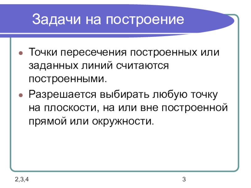 2,3,4   Задачи на построениеТочки пересечения построенных или заданных линий считаются построенными.Разрешается выбирать любую точку на