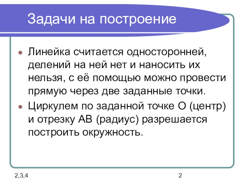 2,3,4   Задачи на построение Линейка считается односторонней, делений на ней нет и наносить их нельзя,