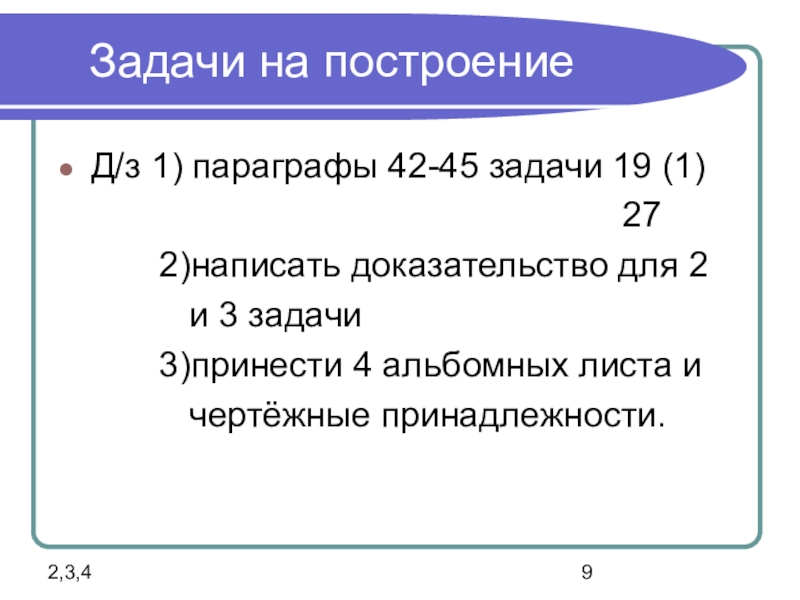 2,3,4   Задачи на построениеД/з 1) параграфы 42-45 задачи 19 (1)