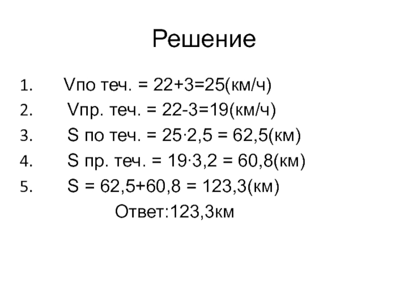 Скорость теплохода против течения равна сумме скоростей катера и течения