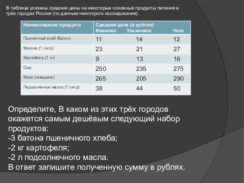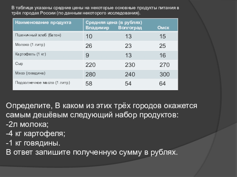 Определите, В каком из этих трёх городов окажется самым дешёвым следующий набор продуктов: