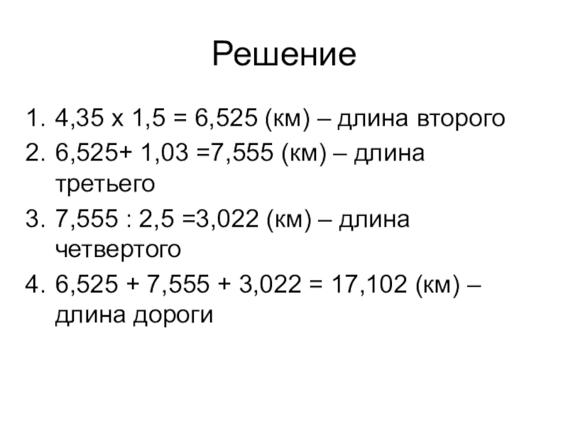 Решение4,35 х 1,5 = 6,525 (км) – длина второго6,525+ 1,03 =7,555 (км) – длина третьего7,555 : 2,5