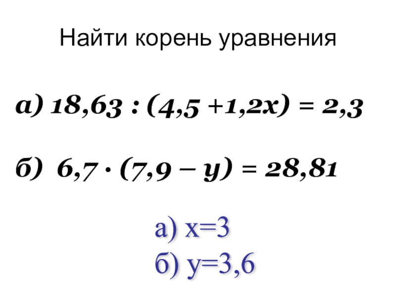 а) 18,63 : (4,5 +1,2х) = 2,3б) 6,7 · (7,9 – у) = 28,81Найти корень уравненияа) х=3