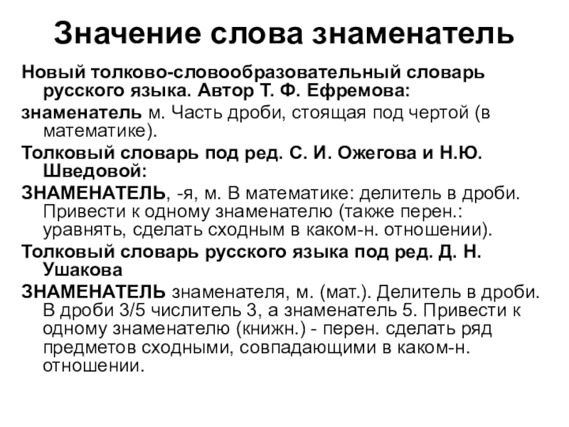 Значение слова знаменатель Новый толково-словообразовательный словарь русского языка. Автор Т. Ф. Ефремова: знаменатель м. Часть дроби, стоящая под